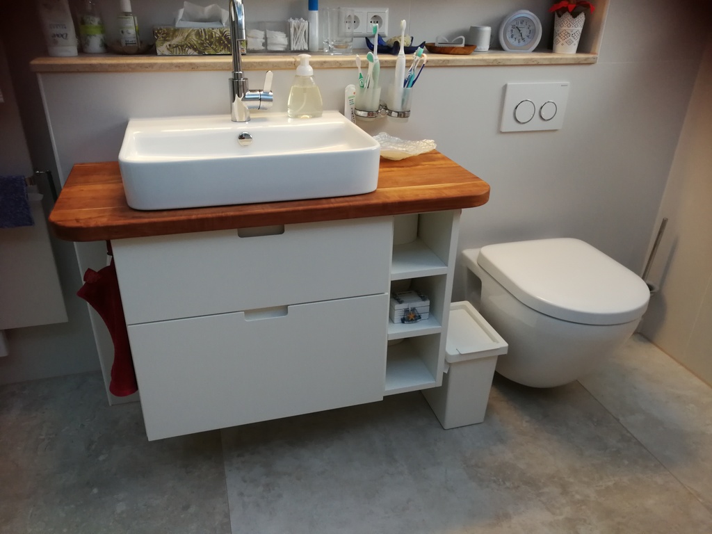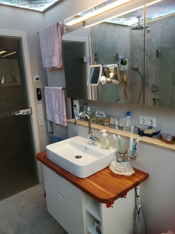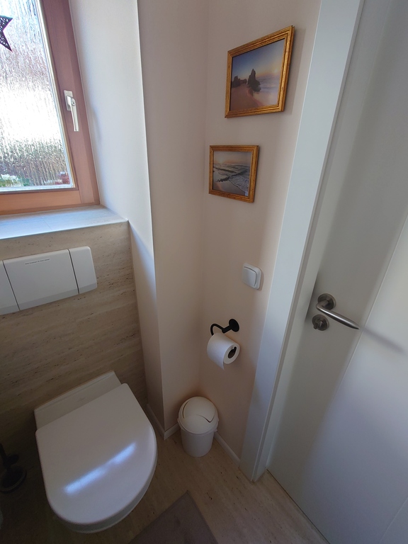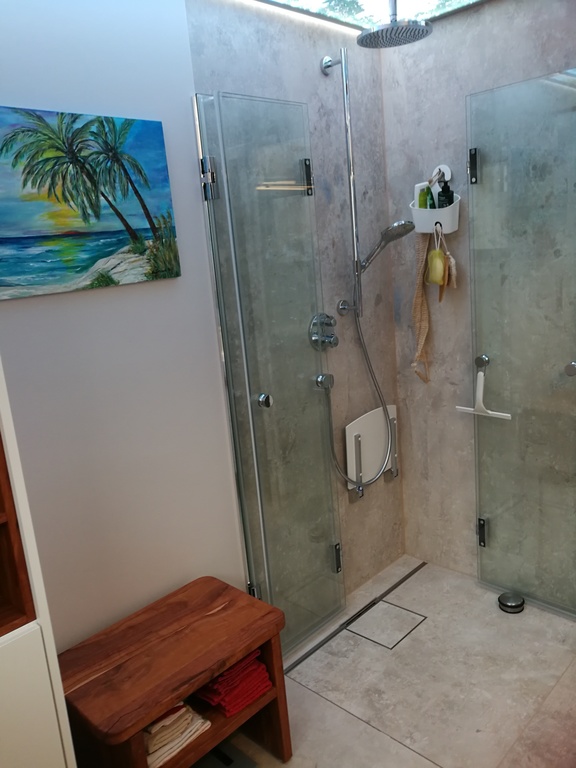 Wir haben 1 Gästetoilette und 1 Badezimmer mit ebenerdiger Dusche, 3 Schlafzimmer und eine Tiefgarage mit direktem Zugang ins Haus. Neu: Alle Fenster im Erdgeschoss und in der 1. Etage sind mit Insektengitter ausgestattet. Die Terrassentüre hat eine Insektengitter-Schwingtüre.