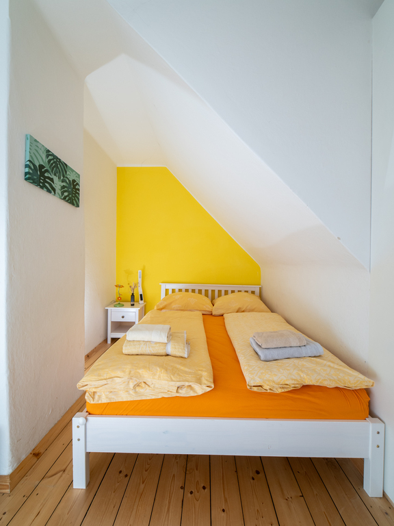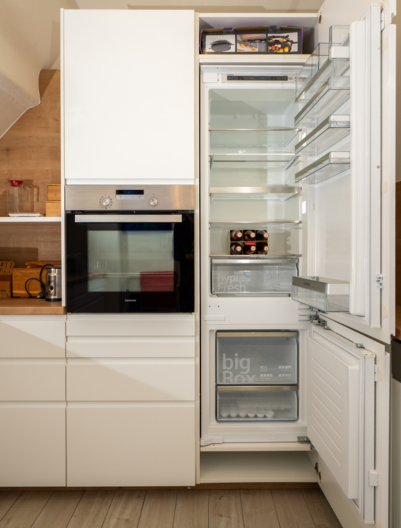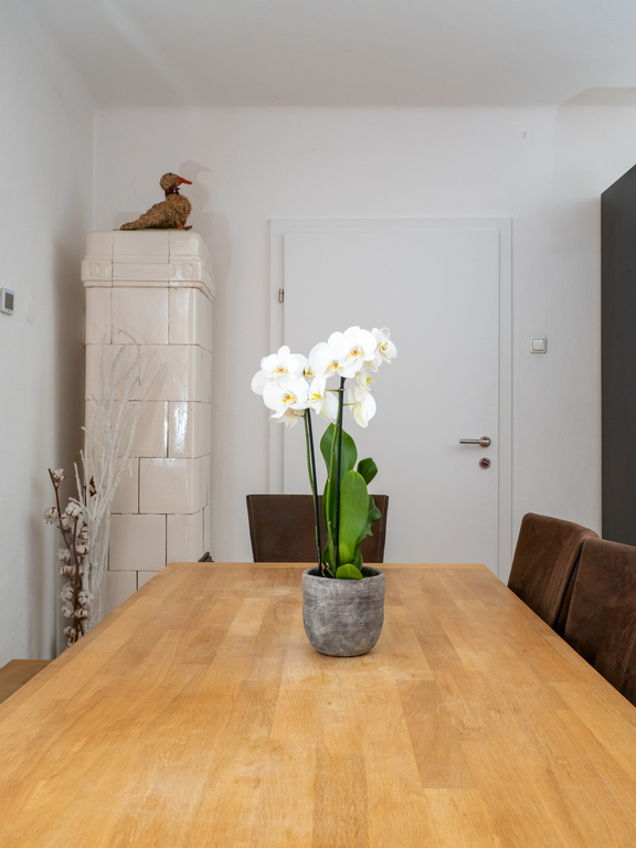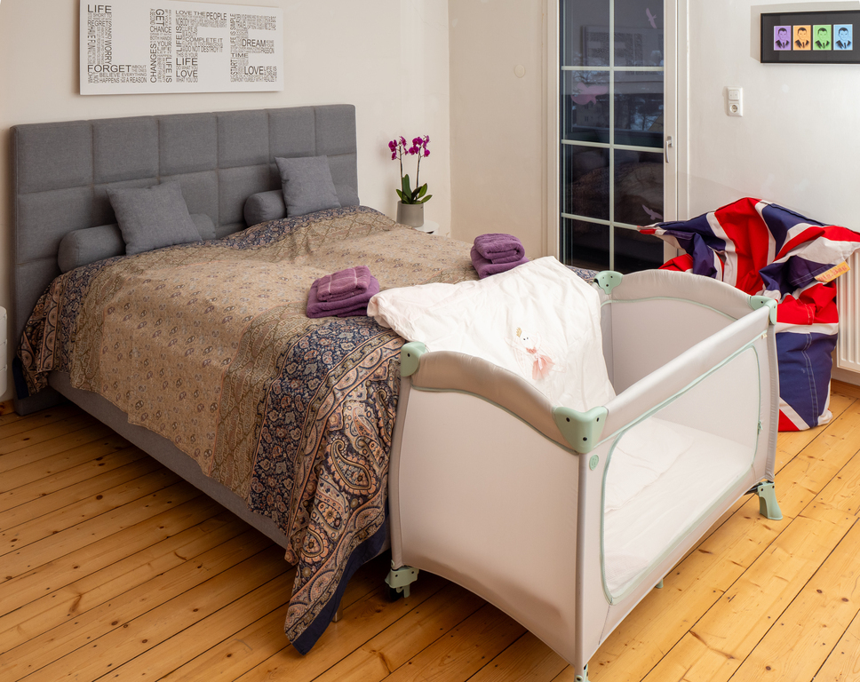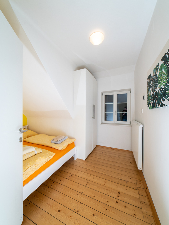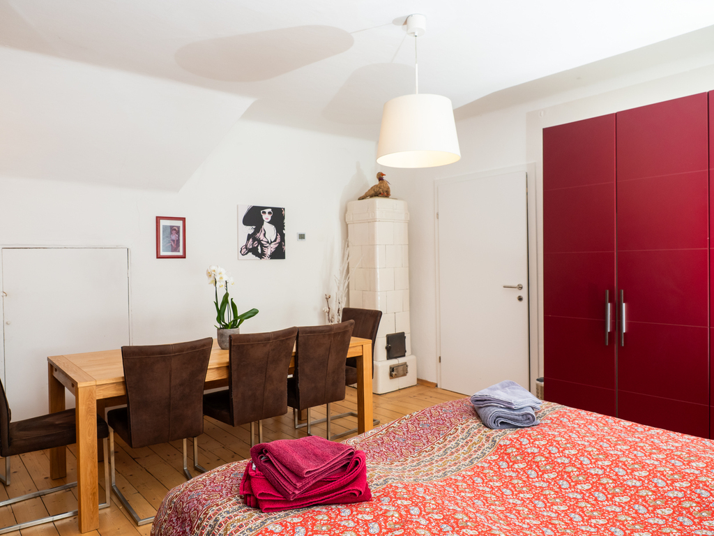 The holiday apartment includes two master bedrooms featuring king size beds (one with a sunny Eastward facing balcony with a stunning view and deckchairs, the other with a South-facing balcony as well as a sofa convertible into a king-size bed). The third - small - bedroom hosts a 1,40m wide double bed. The apartment is equipped with a bathroom featuring a shower and toilet as well as a double handwash basin. In addition, there is a separate toilet, an outdoor sauna with a panoramic view with a terrace and deck-chairs as well as cold water. The kitchen is fully equipped. A roofed patio with a large table comfortably seating 8 people invites you to spend your pasttime in the warmer months. A gas-fired BBQ is situated next to it. The old apple tree is perfect for using the double hammock in summer. In addition to the garage, a large parking lot offers additional space for cars. In front of the house, the huge trampoline invites you to use it. There is also a basic swing under the apple tree. As the house enjoys a privileged location directly below the castle of Obermurau, it is only accessible by stairs from the parking lot.