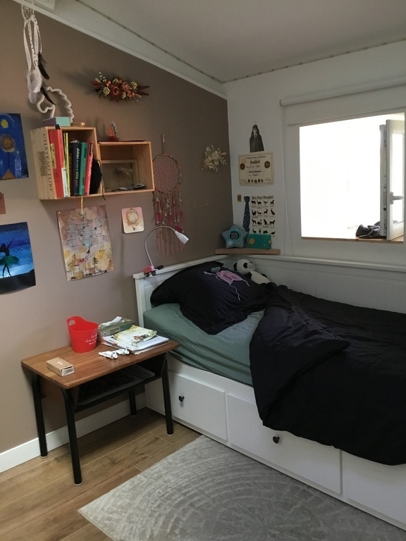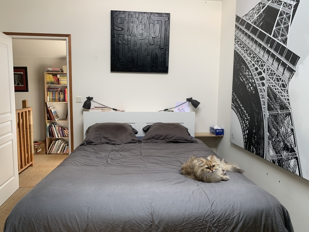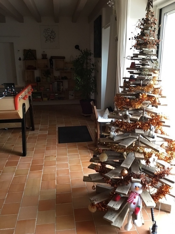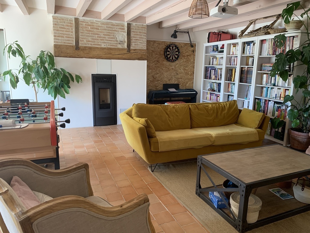 The ground floor is fully opened, with a southern exposure and large bay-windows. The wide living-room contains a fireplace that we use to heat the house during winter, a library, a video corner with a video-projector, a piano, a game of darts and a table football. The access to the kitchen aera is opened too. We have a sofa-bed that can be use occasionally.