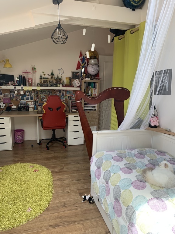 Upstairs, there is a parental bedroom with a private wardrobe and a private bathroom (shower and toilet), close to an office.