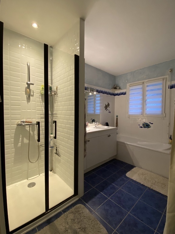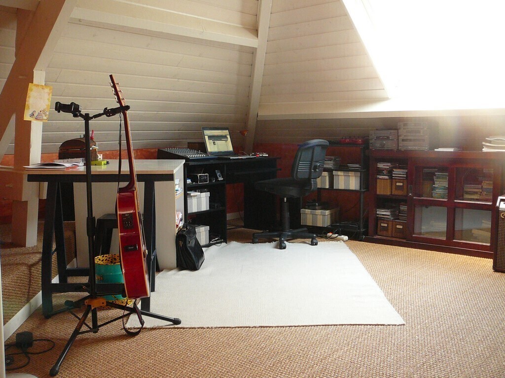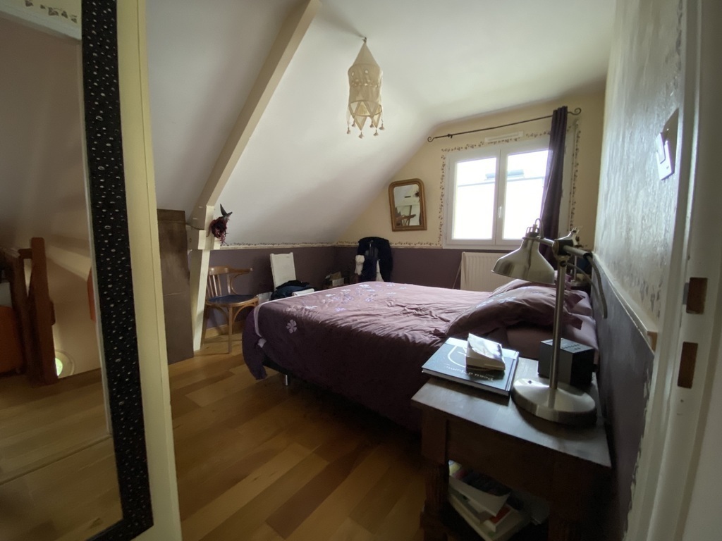 A l’étage : 3 chambres (3 avec lit double), 1wc, 1 salle de bain avec douche et un bureau (avec instruments de musique dont un piano numérique). Le grenier peut aussi être equipé en chambre.