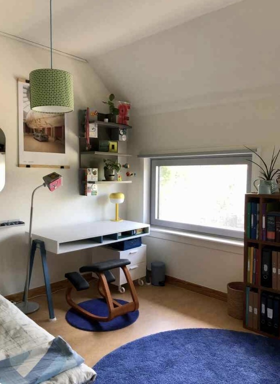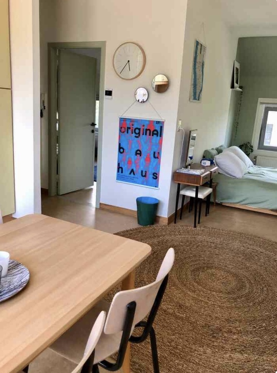 The apartment on the second floor has all it takes for a cosy stay with your family or friends, with space for 3 persons. The room is spacious and has the feeling of a small loft. The open space has a large kitchen, eating area, acces to the suncovered rooftop terrace and a sleeping area with a queen size bed. Separate bedroom with single bed and working space. Bathroom (guests only) with shower, toilet and sink. Suncovered rooftop terrace overlooking the garden, all on the second floor.